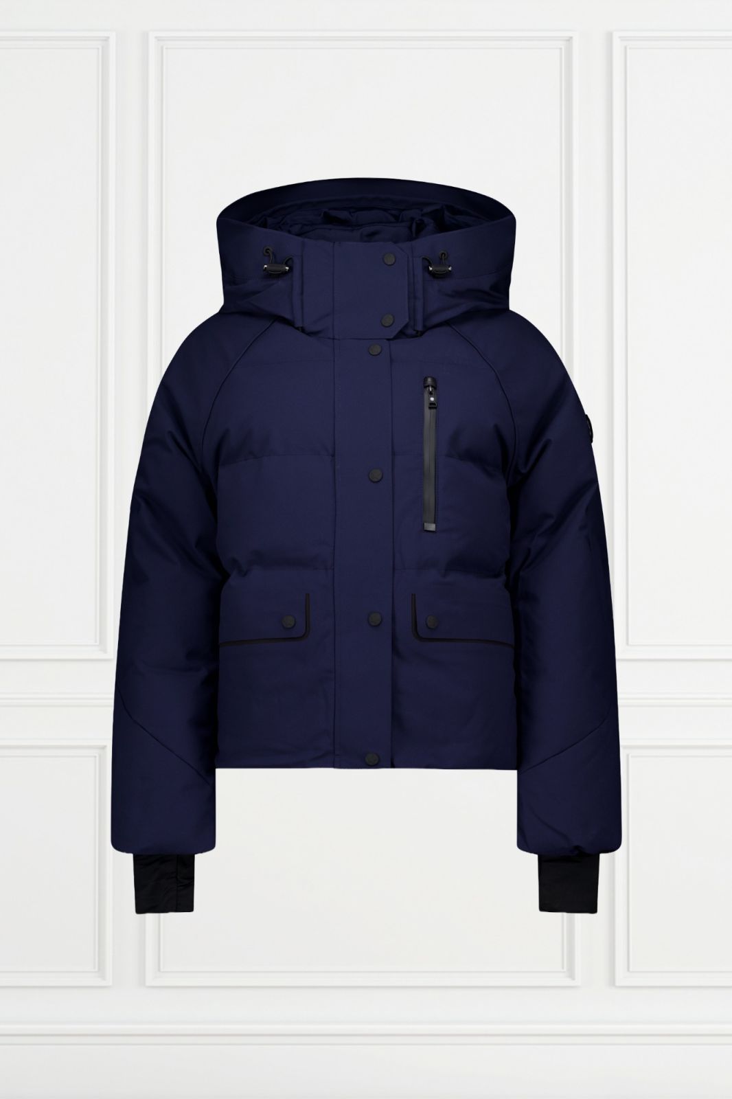The Cherry Peak Jacket features an adjustable hood with Airforce wording. The jacket closes with a waterproof zipper and a magnetic storm flap. It has two front pockets with zippers and magnetic flaps, a chest pocket with a waterproof zipper, and a ski pass pocket on the left sleeve. The cuffs are adjustable with Velcro and include thumbholes. Inside, the jacket has a snow skirt and two inner pockets with zippers. It is windproof, water-repellent, and made from a matte fabric with a metal logo badge on the sleeve.
