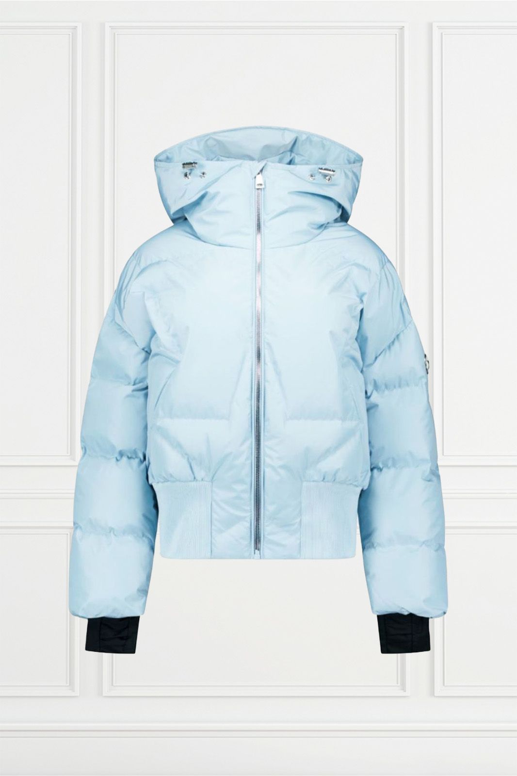 The Snowstar Jacket is windproof and water-repellent. It features a fixed, adjustable hood, two front pockets, and two zippered inner pockets. For extra protection, the jacket includes a snow guard. Stars are stitched across the entire jacket, creating a unique look. The left sleeve features an Air-Force logo badge and a ski pass pocket. The sleeves have thumbholes and the jacket has an elastic waistband that fits snugly above the hips. The jacket closes with a zipper.