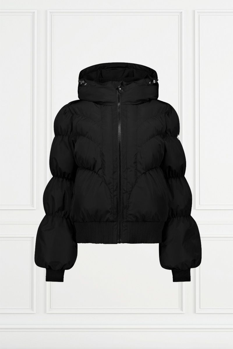 The Sugarbush Bomber Jacket is windproof and water-repellent. It features a fixed, adjustable hood and a high collar for a snug fit. Equipped with two inner pockets and a snow guard. The jacket has two outer pockets with invisible zippers. The left sleeve features an Air-Force logo badge and a ski pass pocket. The sleeves do not have thumbholes but are finished with elastic cuffs. The hem has an elastic band that fits snugly above the hips. The jacket closes with a zipper.