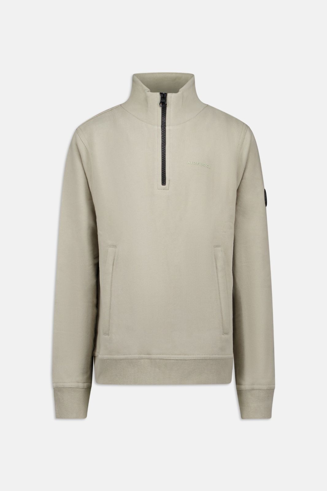 The Sweat Quarter Zip features a high black zip closure. On the left chest there is a rubber 3D Air-Force wording logo, and on the left sleeve a black Air-Force logo badge. The sweater has two zippered pockets, and the ribbed cuffs at the hem and sleeves ensure a good fit.