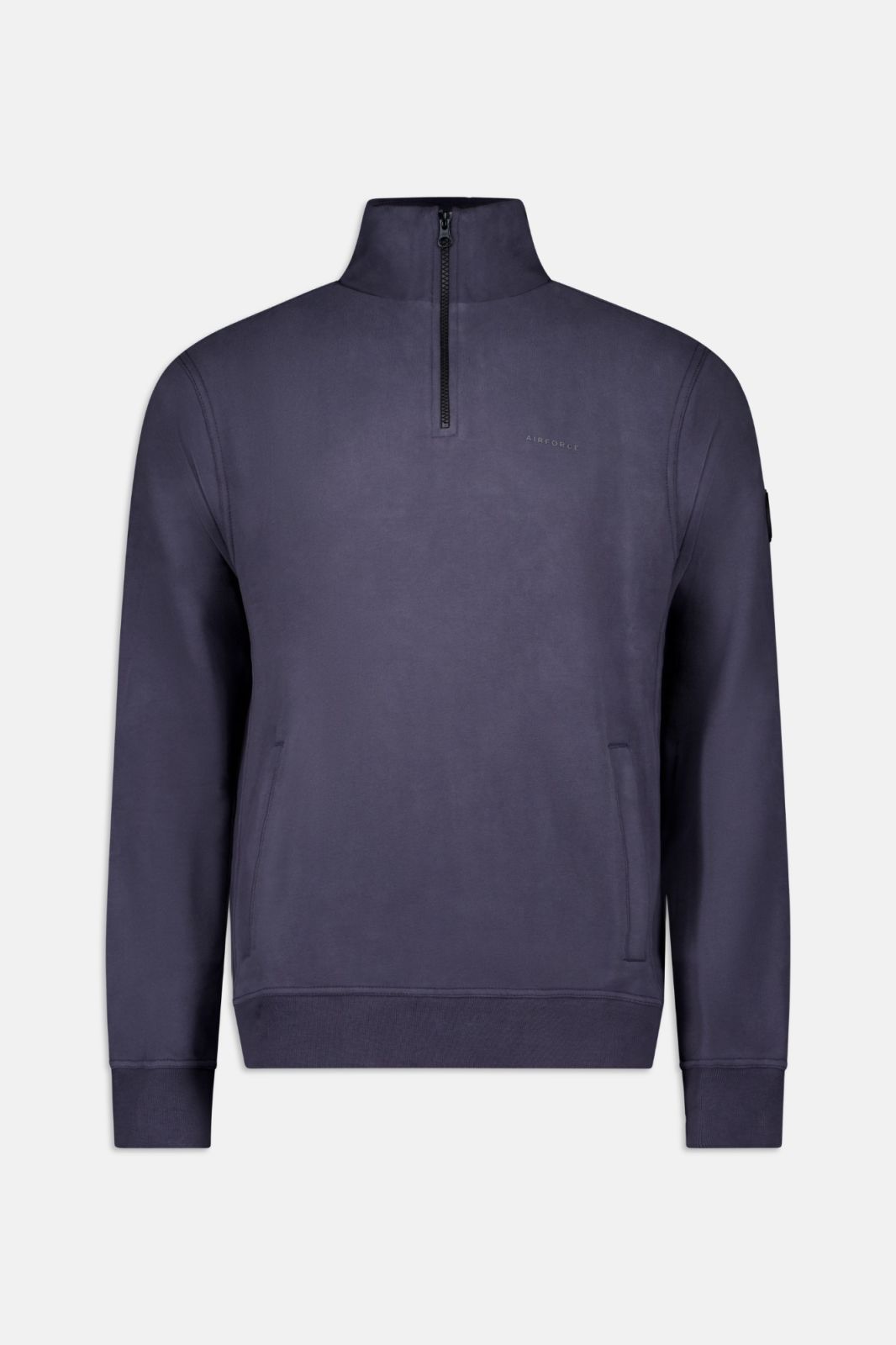 The Sweat Quarter Zip features a high black zip closure. On the left chest there is a rubber 3D Air-Force wording logo, and on the left sleeve a black Air-Force logo badge. The sweater has two zippered pockets, and the ribbed cuffs at the hem and sleeves ensure a good fit.
