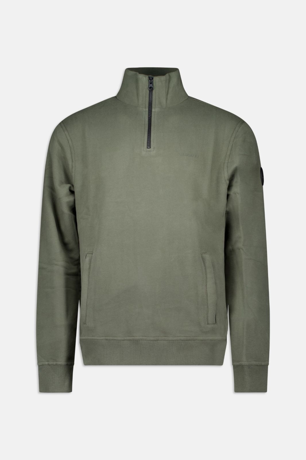 The Sweat Quarter Zip features a high black zip closure. On the left chest there is a rubber 3D Air-Force wording logo, and on the left sleeve a black Air-Force logo badge. The sweater has two zippered pockets, and the ribbed cuffs at the hem and sleeves ensure a good fit.