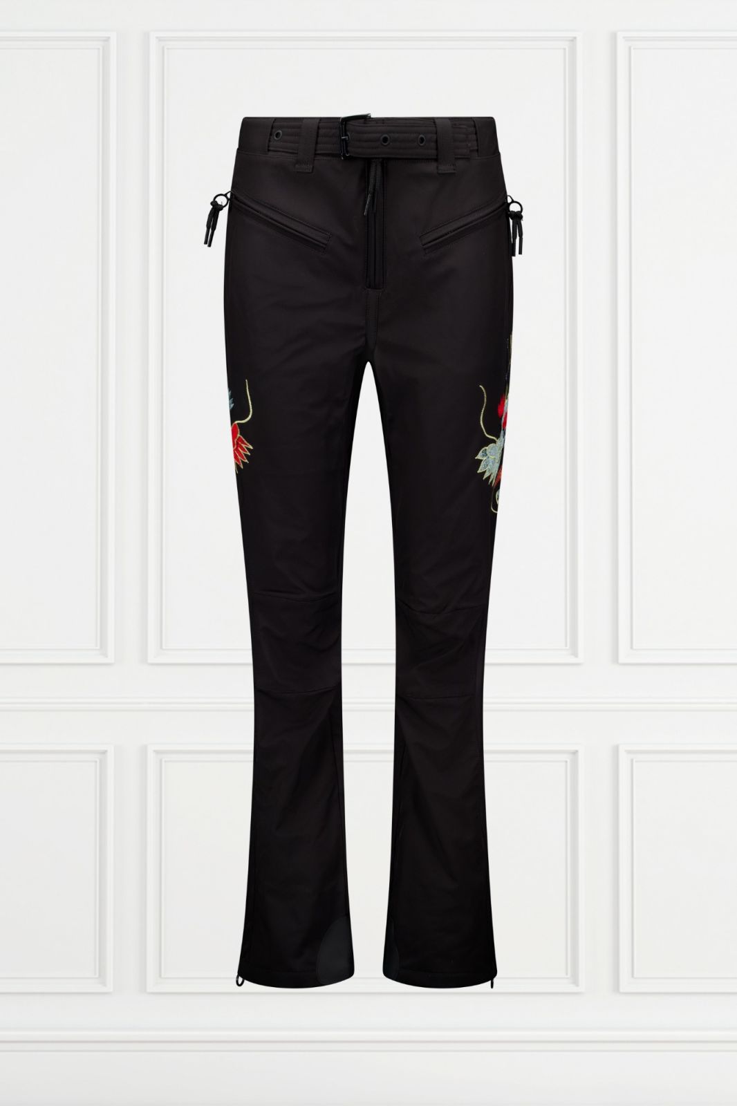 The Vermon Ski Pants Dragon is a technical ski pant featuring an embroidered dragon detail on both sides of the hips. The pants include a zipper and double snap-button closure, along with an adjustable belt and buckle for a secure fit. On each hip, a zipped pocket provides practical storage for essentials. Zippers at the bottom of the legs allow the pants to be easily worn over ski boots.